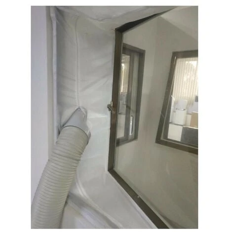 Joint de fenêtre en tissu blanc avec ouverture/fermeture à glissière, pouvant accueillir le tuyau d’échappement de votre climatiseur amovible. Il empêche l’air chaud, l’humidité et les insectes de rentrer dans la pièce.